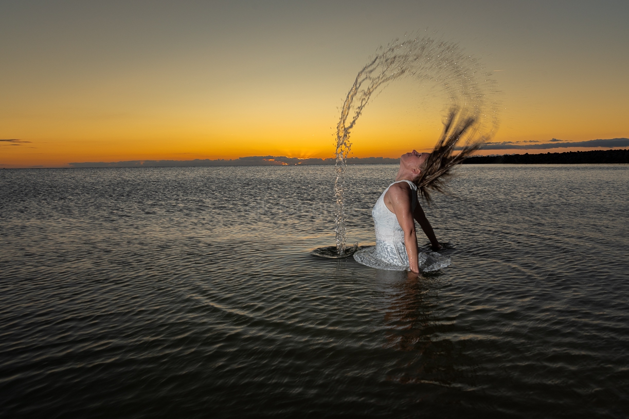 Dit stond al tijdje op mijn bucketlist, maar het kwam er maar niet van. Ik wilde een model bij een mooie sunset fotograferen en hierbij oefenen om een mooie hair_splash te maken. Ik vond Gerie bereid om dit te gaan doen. Echter wanneer heb beide tijd EN wanneer heb je de mooiste sunsets. Ik vind de mooiste in het najaar en vroege voorjaar. Als de temperatuur wat lager is en minder stof in de lucht is. Het nadeel is natuurlijk dat het water ook wat kouder is.